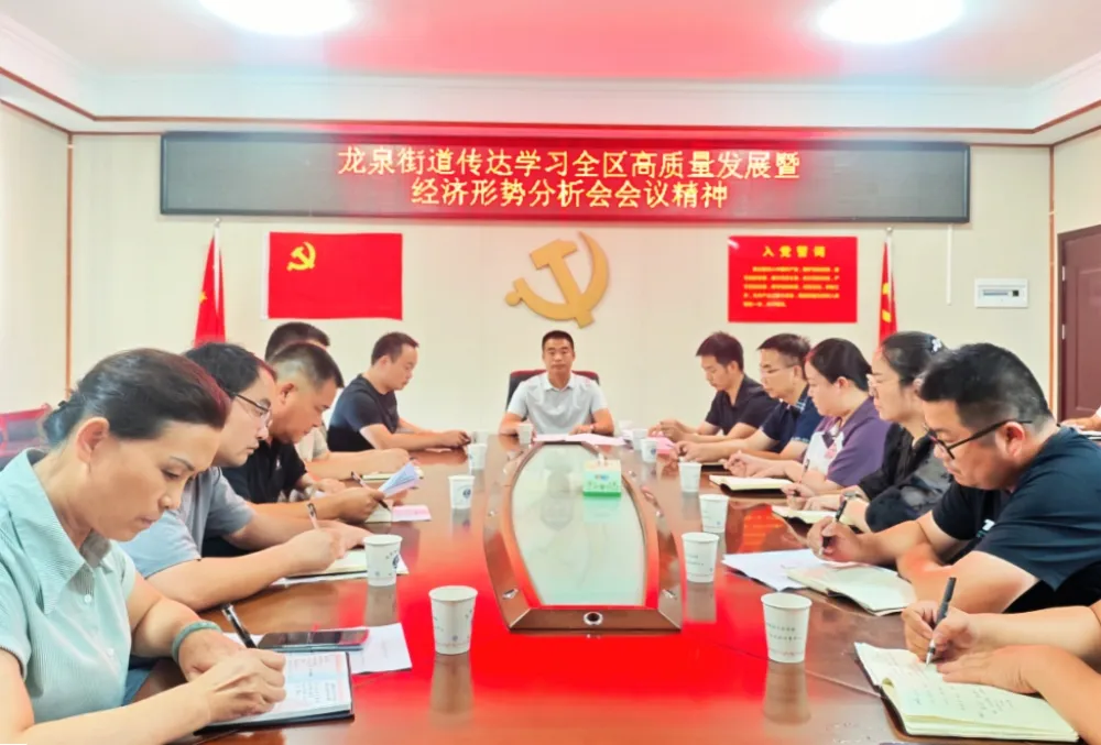 8月28日,龙泉街道召开传达学习全区高质量发展暨经济形势分析会,学习传达相关会议精神,安排部署下阶段工作任务,动员街道上下统一思想、铆足干劲,锚定年度目标、全面振奋精神,实施“三大战略”,开展“三大行动”,全力惠民生、稳增长、促发展,为推进和美西洞庭建设,努力交出全年高质量发展的龙泉答卷。