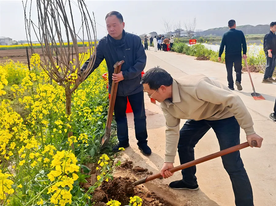 在植树现场,大家三两成组、分工协作,拿起铁锹、水桶等工具,一起挥锹铲土、扶苗栽种、提水浇灌,各个环节有条不紊,现场一片热火朝天的劳动景象。经过辛勤的劳作,六十余株新栽下的晚樱苗木迎风挺立,焕发出勃勃生机与活力