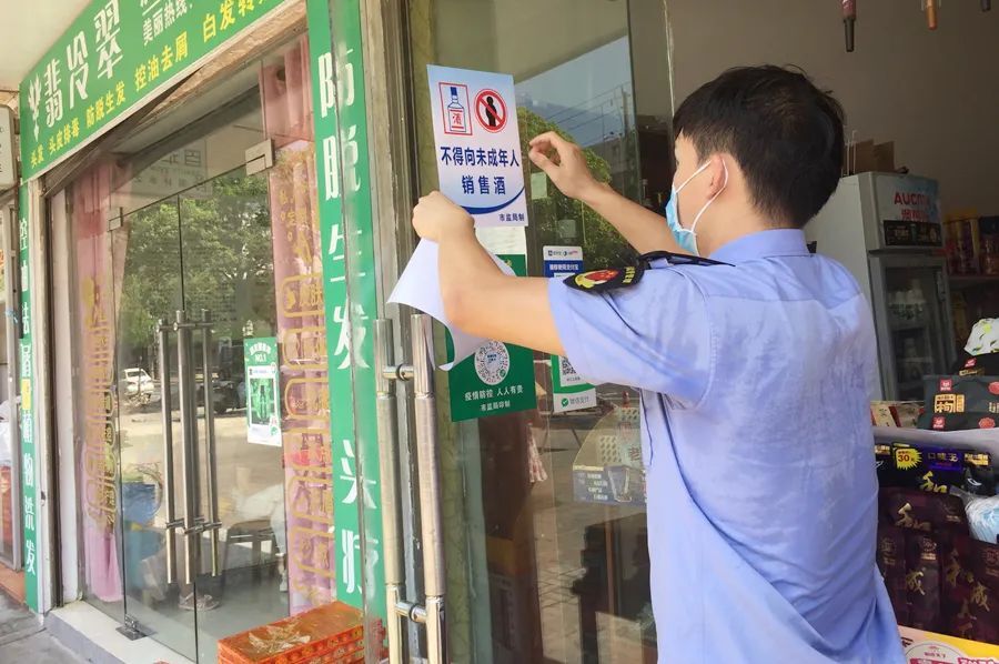 监管人员张贴禁止向未成年人售酒标志