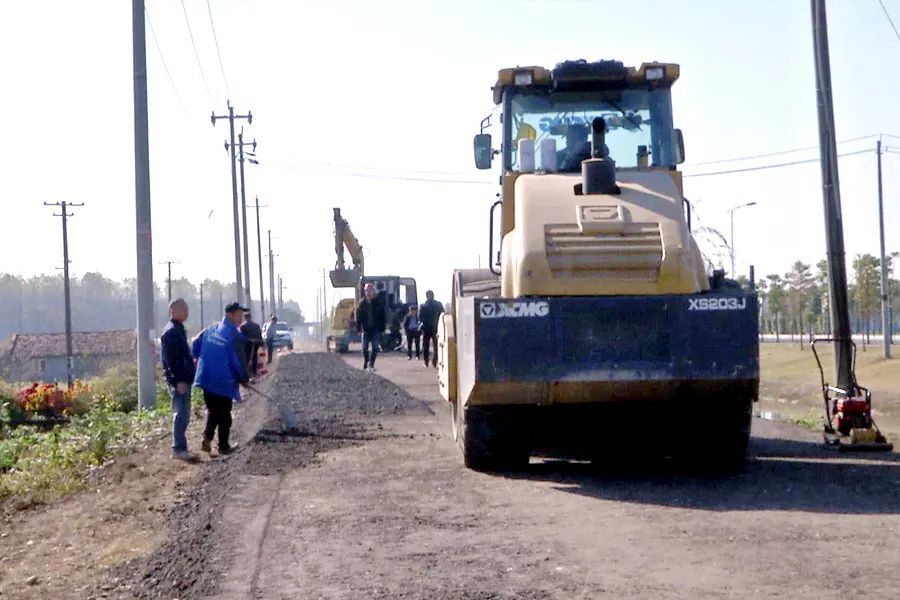 在乡道X102上,一台台压路机、挖掘机正马力全开地运作着,据现场工作人员介绍,现在正在进行的是水稳层的铺设,铺设完成后路面将会有更高的强度,以及更好的抗渗度和抗冻性。此项目主要对乡道X102进行修整并加宽,道路全长7公里,原路段路宽为3.5米,加宽后,路面宽度为5米。