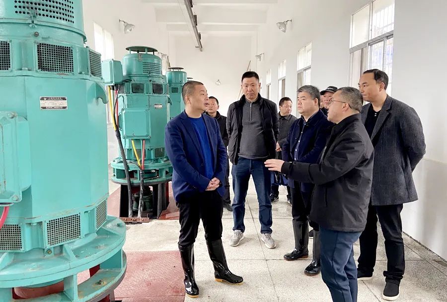 刘爱军、胡晓明一行在牛屎湖泵站督导泵站运行及排涝调度情况