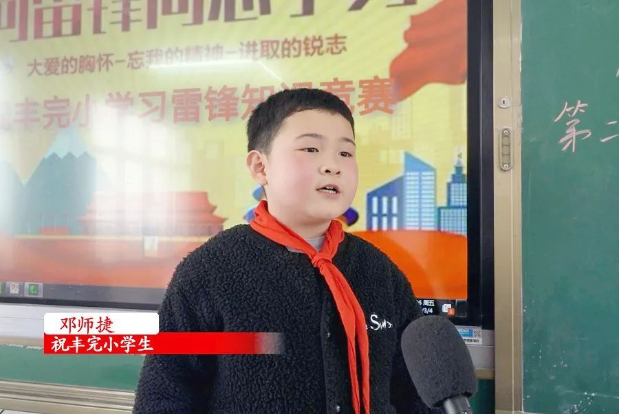 (祝丰完小学生 邓师捷:通过这一次知识问答竞赛,我懂得了关于雷锋叔叔的更多事迹,我以后也会向他一样乐于助人。)