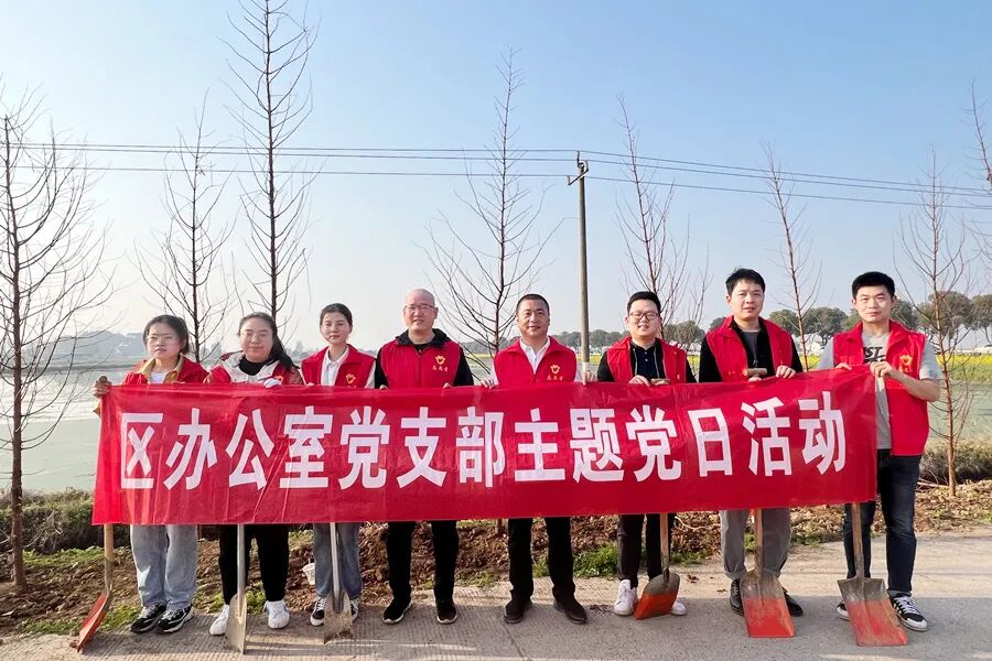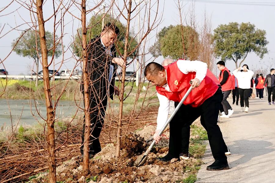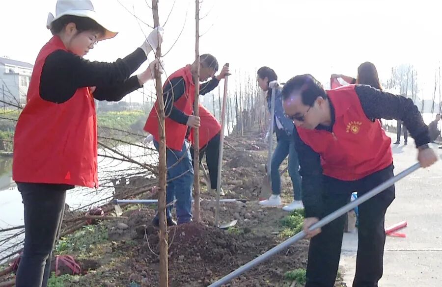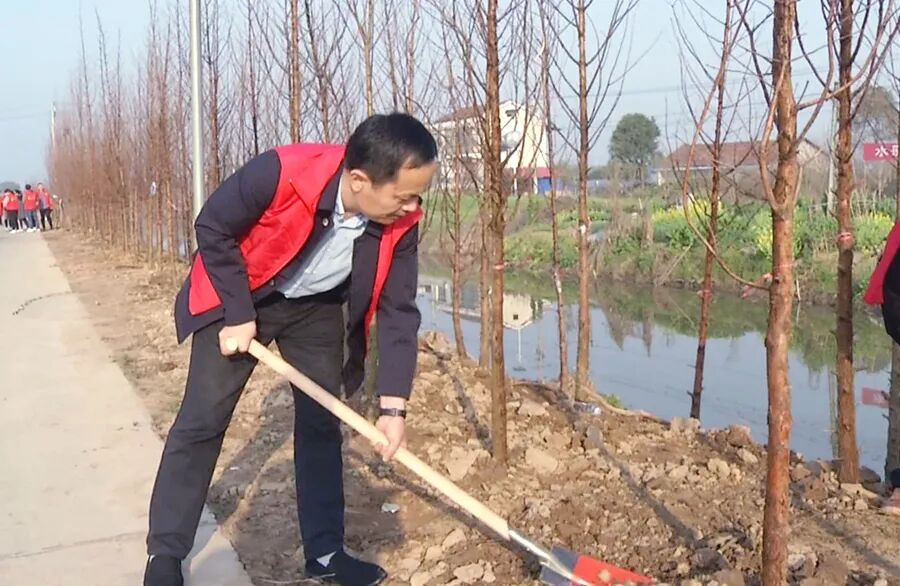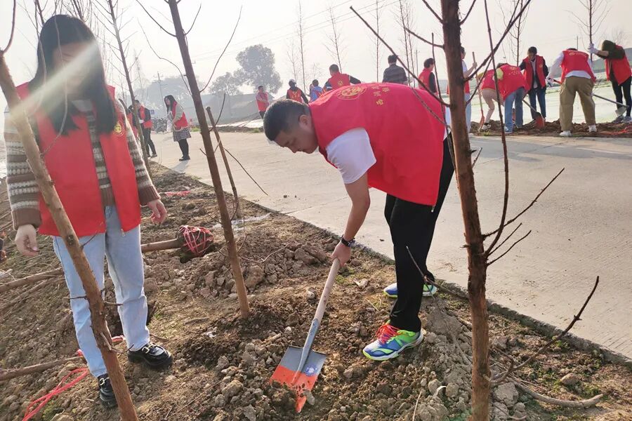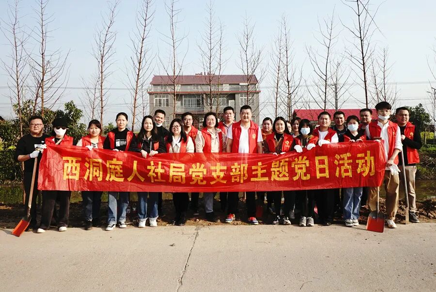 三月的西洞庭,春回大地,万物复苏。上午八点,西洞庭管理区党委书记刘爱军,区党委副书记、管委会主任胡晓明与全体在家区领导带领全体机关干群穿着红马甲,拿起铁锹热情高涨的投入到植树活动中。从经四渠到纬六渠交界处往东,到处可见植树添绿的热闹场景。大家分工明确、配合默契,挥锹铲土、扶正树苗、填土夯苗、围堰浇水。