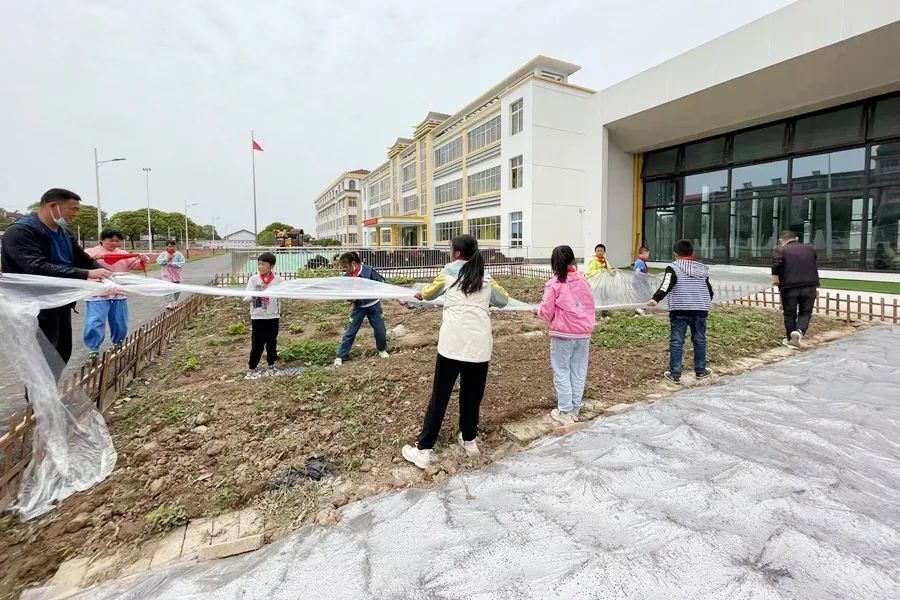 活动中,老师为学生们介绍种植果苗的种类、特点,提高学生参与劳动实践的积极性,并耐心指导学生完成果圃铺薄膜、挖坑、植苗、培土、浇水等步骤。劳动课内容丰富,很受学生的喜爱。