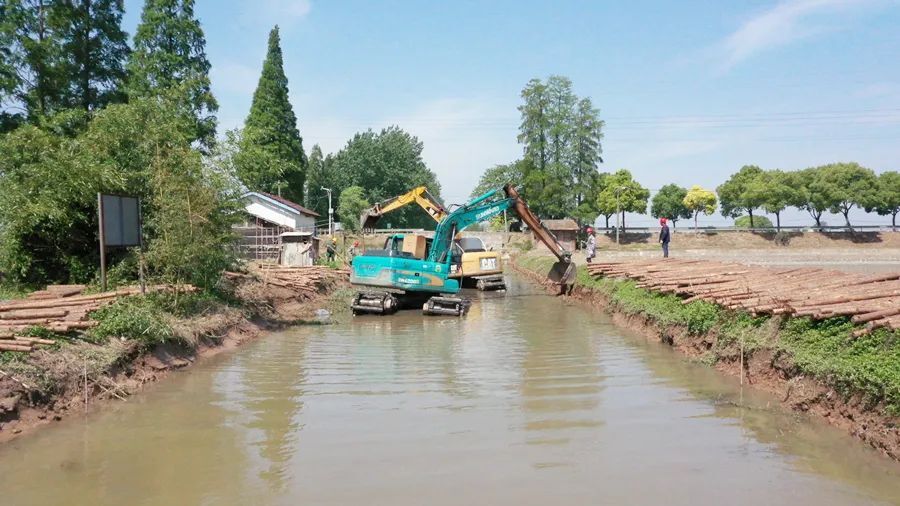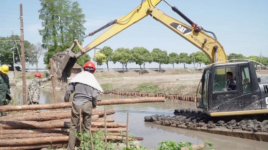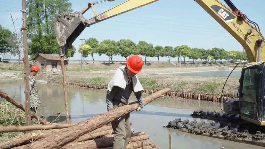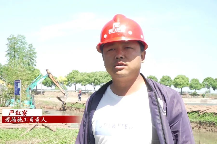 (施工现场负责人 严红富:昨天深木桩和挖机全部到位,今天早上开始动工,预计需要打三万根深木桩,打完桩之后开展生态河湖建设,种植三叶草,进行美化绿化。)