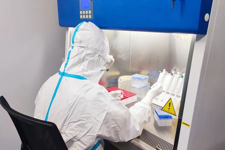 当核酸样本通过专用转运箱运输到实验室的那刻起,检测人员就开始与时间赛跑。他们争分夺秒,在负压检测空间和高度紧张集中的状态下,高强度工作6小时。每个步骤,都要细致再细致,谨慎再谨慎。每一批次的核酸检测都是对检验师体力、耐力的考验。
