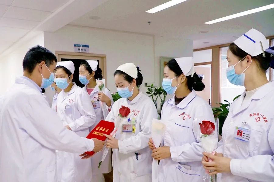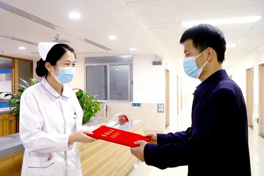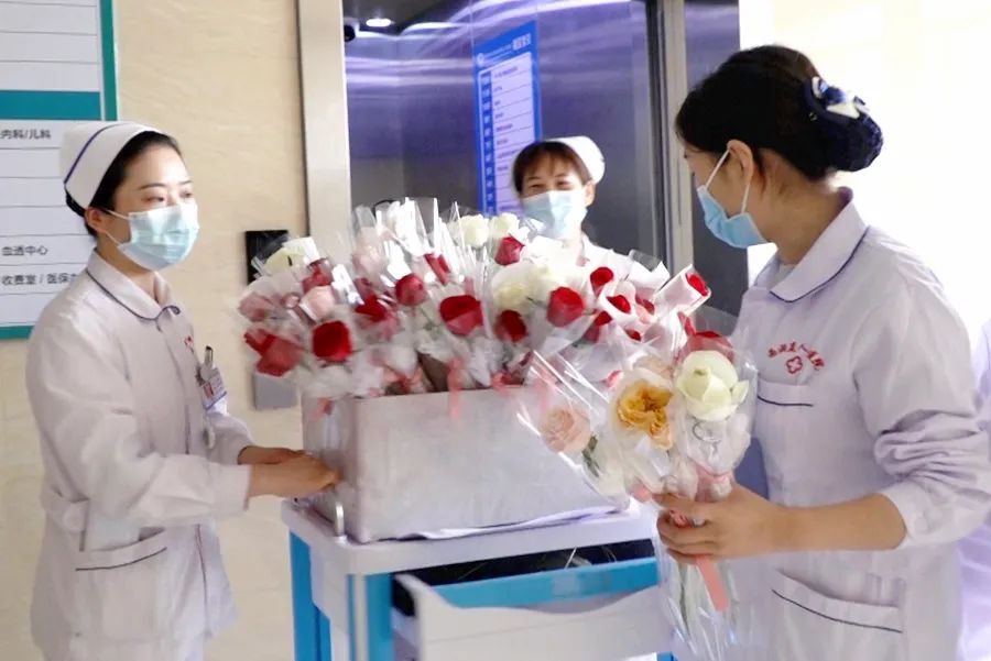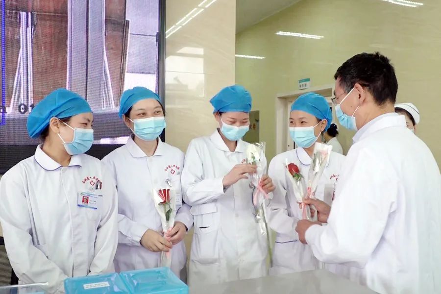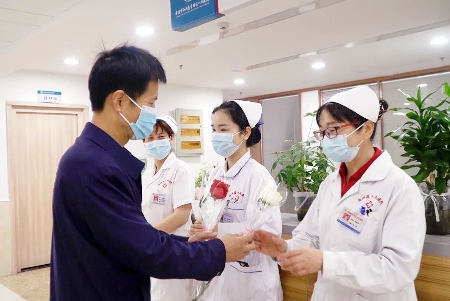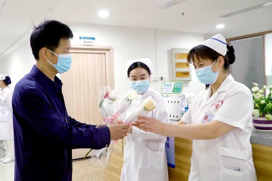 5月12日上午,区人民医院负责人带领各科室负责人来到医院住院部各楼层,为敬爱的护士们送去美丽的鲜花和节日的祝福与问候,感谢她们的“一路守护”。