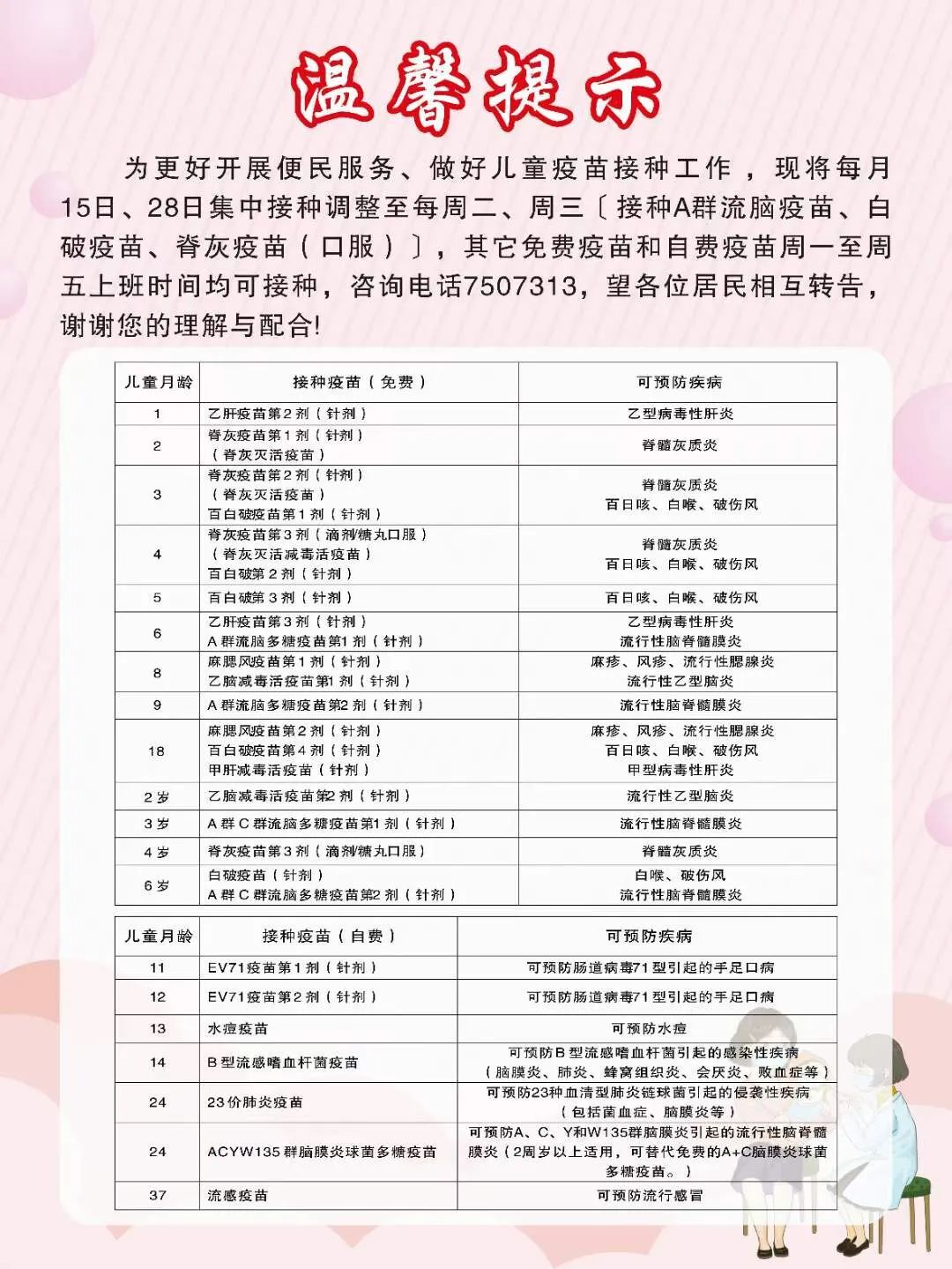 为持续做好儿童疫苗接种工作,近日,记者在我区疾控中心了解到,我区儿童疫苗接种时间将从每月的15日和28日集中接种调整至每周二、周三〔接种A群流脑疫苗、白破疫苗、脊灰疫苗(口服)〕。其它免费疫苗和自费疫苗接种时间是周一至周五上午8:00—中午12:00,下午2:30至5:30。