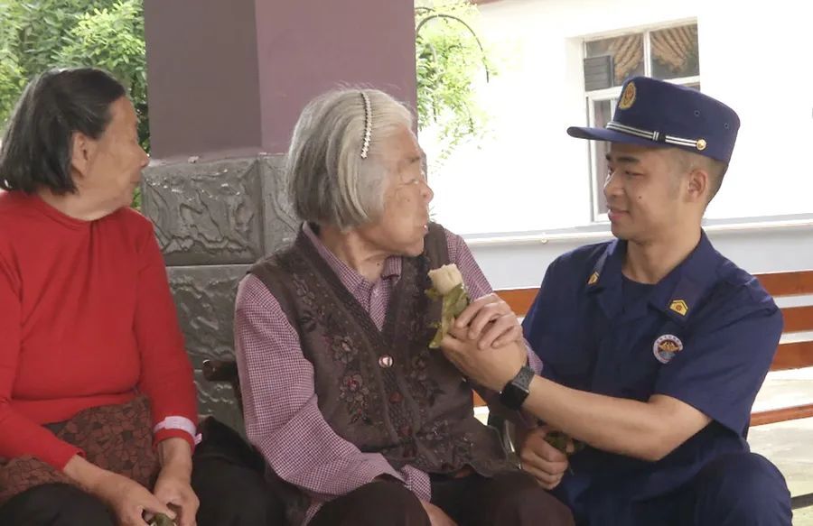 “大爷,今年我们还特意给您包了粽子,带来给你们吃的。”“大妈,我给您梳梳头好吗?”活动现场,消防员们像一群孩子一样围在老人的身边,喂他们吃粽子,给他们修指甲、梳头发,陪他们聊天,老人们看着这群孩子们也喜笑颜开,整个院内,粽香四溢,温情满满。院内的老人告诉记者,每到过年过节的时候,这群“蓝朋友”就会来到敬老院内看望他们,为他们打扫院子、整理房间,自己的儿子女儿不在身边,看到他们就像看到自己的孩子一样开心、温暖。