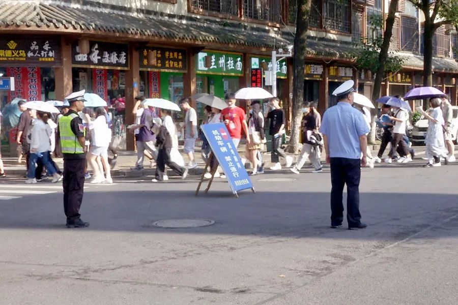 (区公安分局交警大队辅警 孙树旗:针对(来我区进行高考)的西湖一中考生,在他们进考场前的这段路我们实行了临时管制,确保西湖的考生能过安全到达考场。考场周边我们实行了部分的道路交通管制,确保考试周边没有噪音,确保学生安全。)