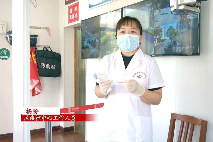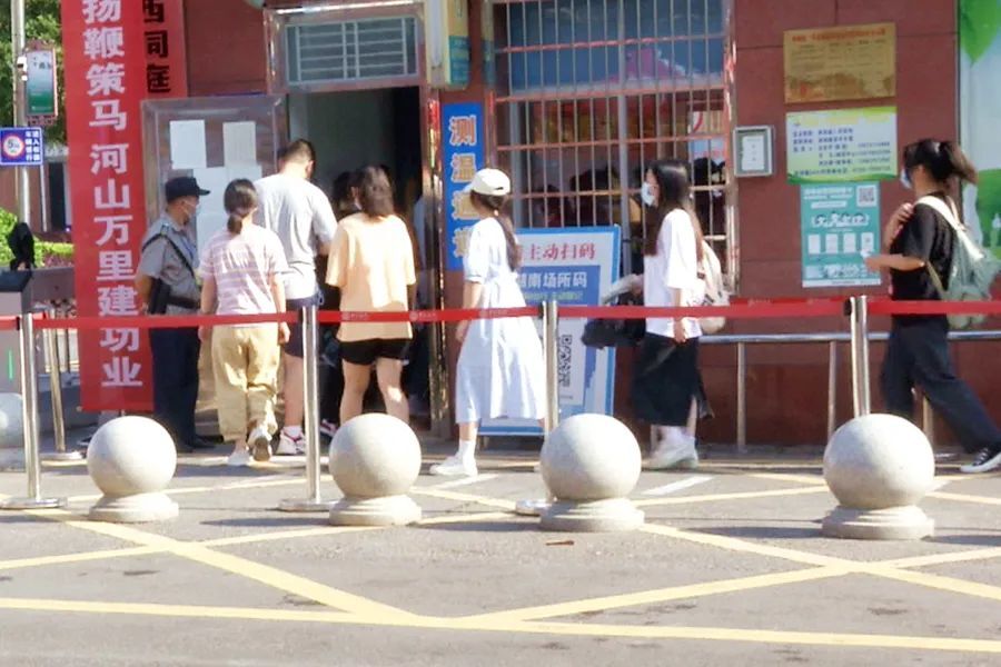 (区疾控中心工作人员 杨盼:由我们和学校的工作人员共同维护(考生进考场的秩序)保持安全距离、佩戴口罩然后(有序)通过我们的体温监测筛查门,如果发现学生的体温异常,我们会用体温枪进行第二次复查,如果体温还是存在异常引导其进入临时观察点休息几分钟后再用水银体温计再次给他复查。)