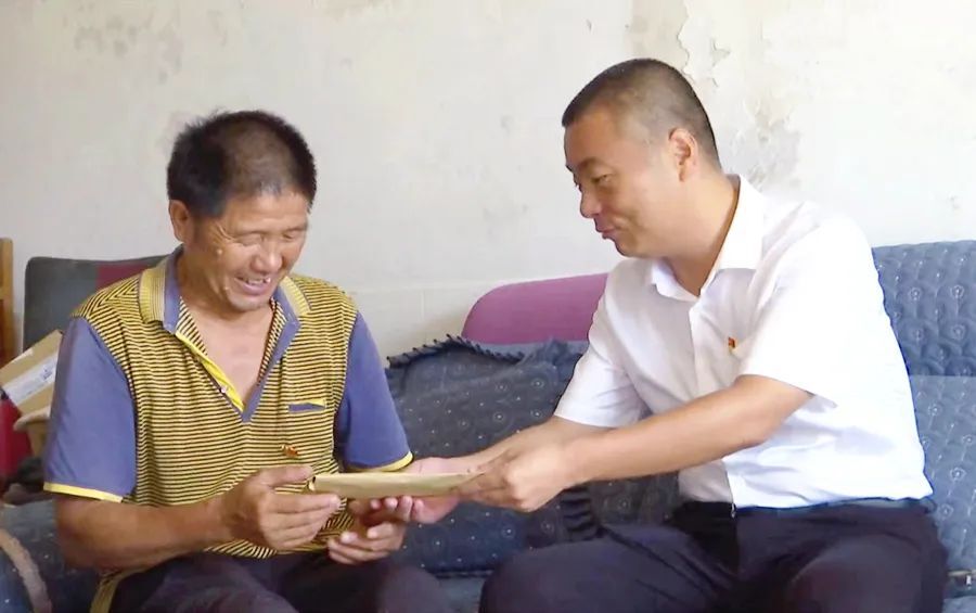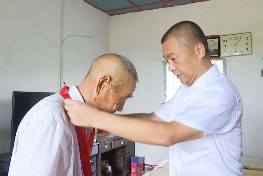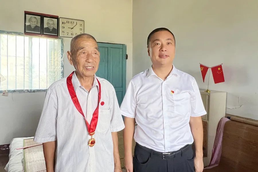 刘爱军走访慰问困难党员周米成,并为他佩戴“光荣在党50年”纪念章