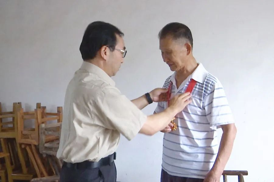 刘建强走访慰问老党员王子林,并为他佩戴“光荣在党50年”纪念章