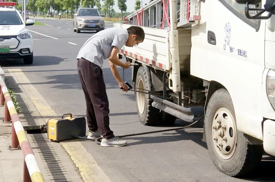 检查行动中,执法人员分工协作,各司其职,对过往的柴油货车车辆进行引导、检查、登记,再由第三方检测机构使用专业检测设备对过往的柴油货车进行尾气排放现场检测,通过随机抽检执法行动,倒逼车主自觉加强车辆日常维护检修,确保尾气达标排放。