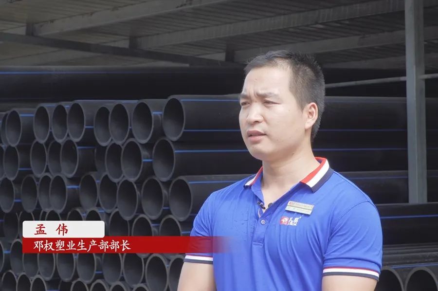 邓权塑业生产部部长 孟伟:在刚开始的时候,条件还比较艰苦,想要保证产品质量那就只有手勤、腿勤、脑勤还有热情。我的工作不只是上班的8小时或者几小时,我要保证生产质量的全过程,如果生产的产品有问题,那就是砸邓权管道的招牌。