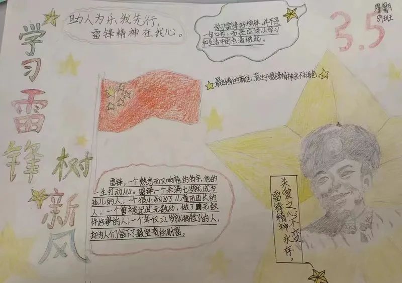 学校组织每班以“弘扬雷锋精神,争做文明学生”为主题的主题班会。班会课上,同学们进一步认识了雷锋,深刻体会雷锋精神的可贵,更加坚定了做雷锋精神接班人的决心。孩子们还积极参与“弘扬雷锋精神”手抄报大赛,全方面展现雷锋的形象,赞扬雷锋的“钉子精神”,歌颂雷锋“全心全意为人民服务”的高尚品质。