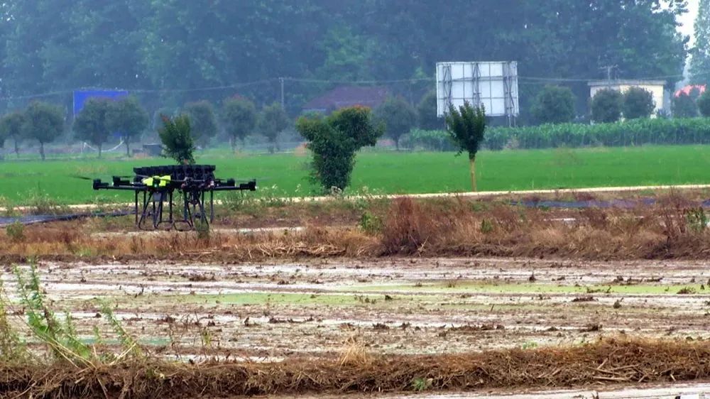随着嗡嗡声响起,无人机在水田上方约2米处飞行,所到之处,一粒粒种子均匀地洒落在水田上。此举标志着超级稻卓两优1126丸粒化直播技术正式在我区开展示范运用。