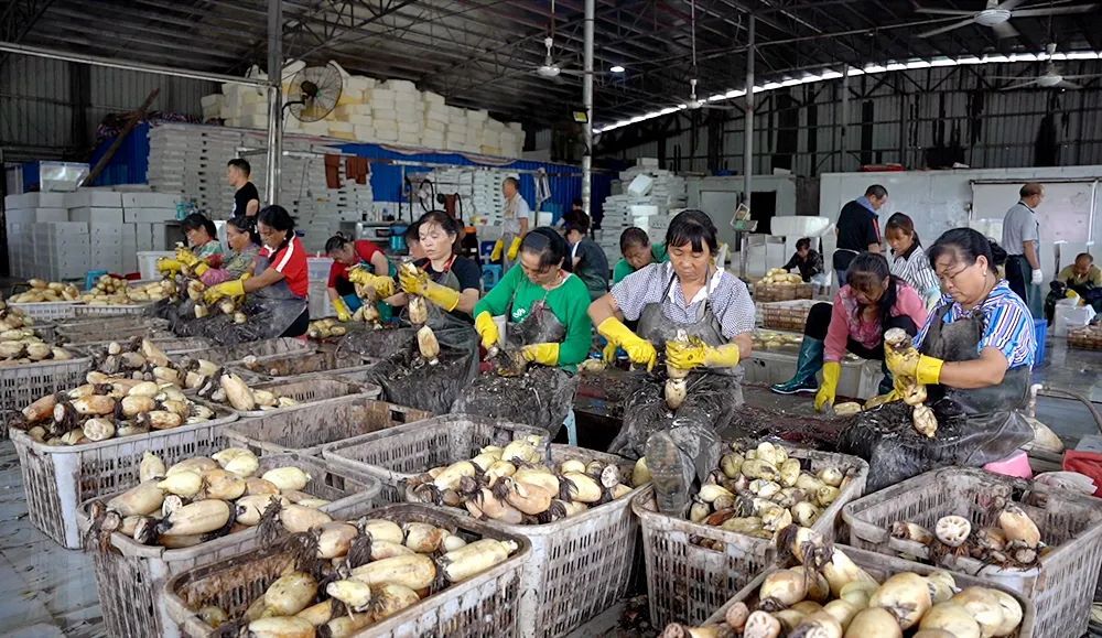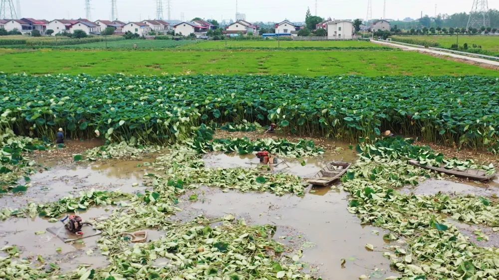 这些带着泥土的新鲜莲藕通过小船运到岸边后,经过简单的清洗、称重后运到当地的家庭农场,再次进行冲洗、打包等工序,随后装车运至全国各个市场,这一派丰收的喜人景象,也成为夏日里一道靓丽的风景线。