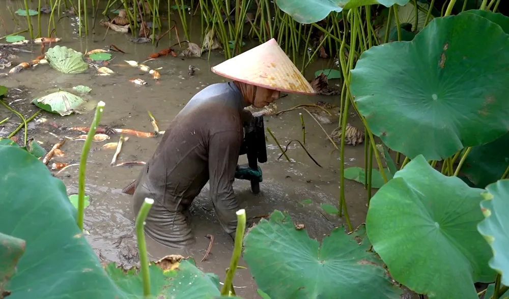采藕工人 黄洋忠:像我每天能挖1000多斤藕,按照4毛钱1斤的价格,我一天能拿400-500元。虽然每天辛苦一点,身上脏一点,但是要比出去打工强很多,时间也不长,屋里也照顾到了。