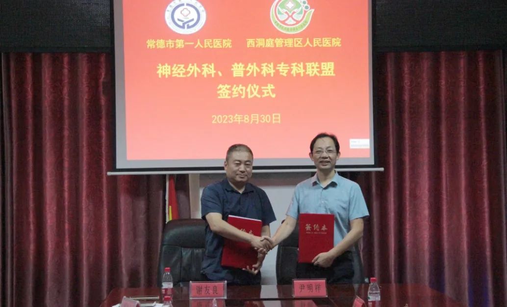 为进一步加强院际之间的交流合作,提升基层医院诊疗水平与医疗服务能力,8月30日上午,常德市第一人民医院与西洞庭人民医院神经外科、普外科专科联盟签约仪式成功举行。
