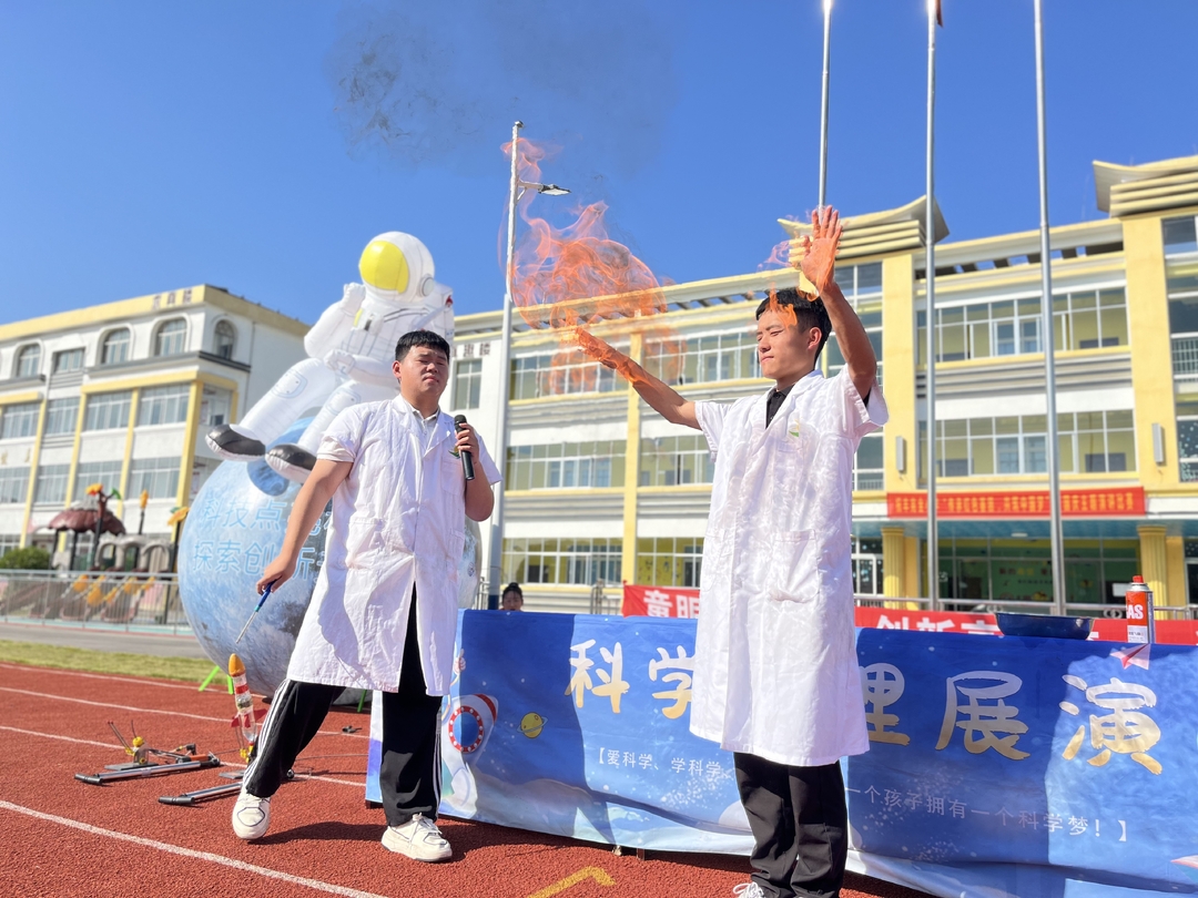 “同学们,你们遇到过困难吗?当遇到困难时你会怎么做呢?是打败困难还是屈服于困难?”老师说道。接着,他带领学生做了一个神奇的水火箭实验。在火箭的底部加上“困难水”,同学们卯足了劲儿为水火箭加压,“咻!”只见水火箭的尾部瞬间进射出大量白色水花,与之同时水火箭腾空而起。我们的“火箭”在跨越了一整个操场后才迟迟落下。本次表演还呈现了混合丁烷与洗洁精能让火焰在手掌上燃烧;物理经典的马德堡半球实验;利用大气压和伯努利原理的逆流而上实验……一个个精彩的演示,引来学生们阵阵欢呼、惊讶声不断,现场气氛热烈。