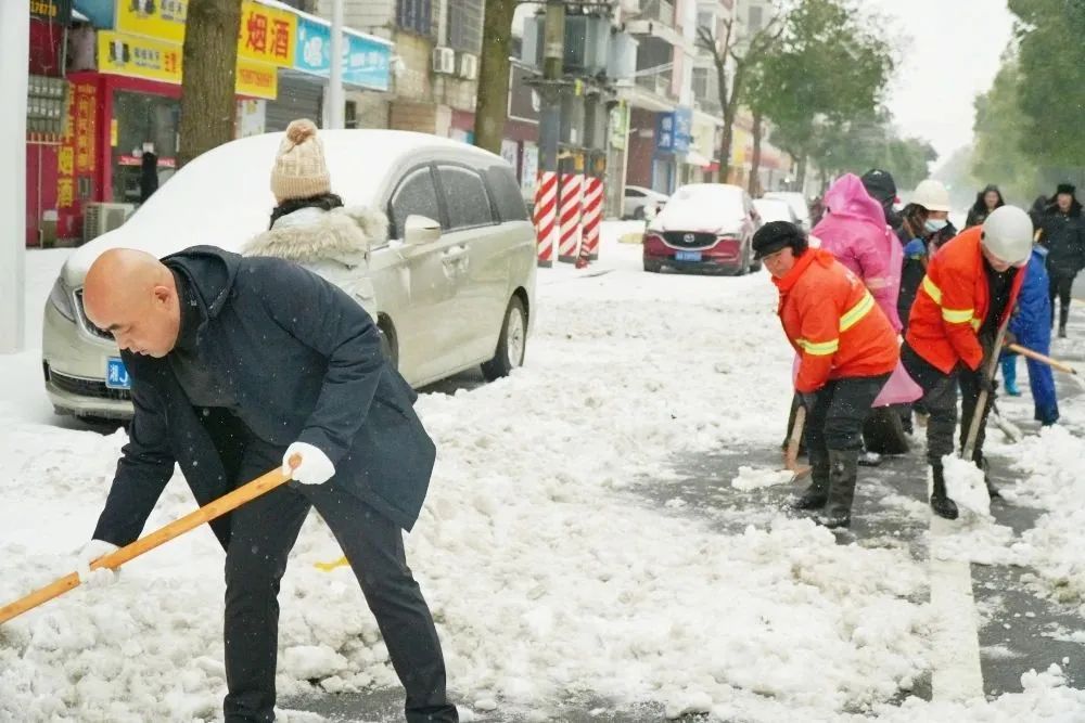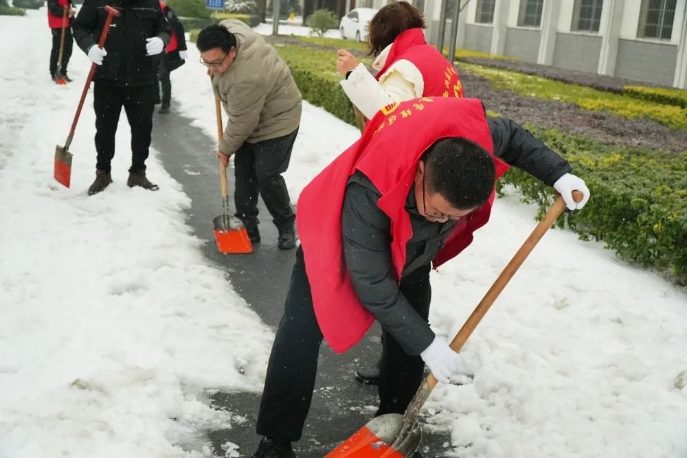 全区干群及志愿者铲雪除冰现场