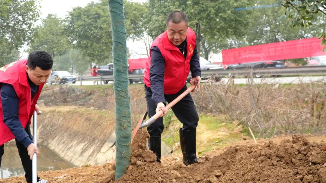 活动现场,大家挥镐扬锹、扶正树苗、培土压实、提水浇灌,每一个环节都严格按照栽植规范进行,整个义务植树活动现场忙碌而有序,合力栽下的新木错落有致、迎风挺立,孕育着勃勃生机,焕发出绿色希望。